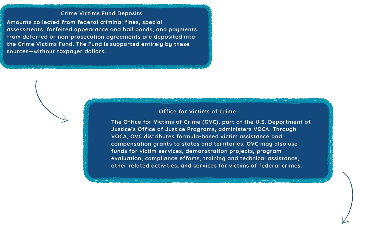 Congress has repeatedly pledged that all amounts deposited into the Fund would remain available in the Fund for victim services. The Victims of Crime Act of 1984 is the Federal government’s only program providing support for programs that serve victims of all types of crime. Each year, Federal criminal fines, forfeited appearance bonds, special assessments, and deferred and non-prosecution agreement payments are deposited into the Crime Victims Fund (CVF). These offender generated revenues — NOT TAXPAYER DOLLARS — are used to support these programs: